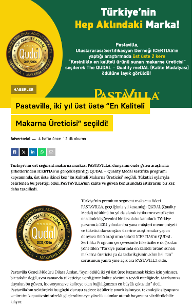 Pastavilla, geçtiğimiz yıl kazandığı QUDAL (Quality Medal) ödülünü bu yıl da alarak istikrarını ve tüketici nezdindeki güvenini bir kez daha kanıtladı. Türkiye pazarında 2014 yılından bu yana müşteri memnuniyeti ve tüketici davranışları üzerine araştırmalar yapan dünyaca ünlü araştırma şirketi ICERTIAS’ın QUDAL Sertifika Programı çerçevesinde tüketicilere doğrudan yöneltilen ‘’Türkiye pazarında en kaliteli ürünü sunan makarna üreticisi ya da tedarikçisinin adını belirtin” sorusunun yanıtı yine açık ara  Pastavilla oldu.